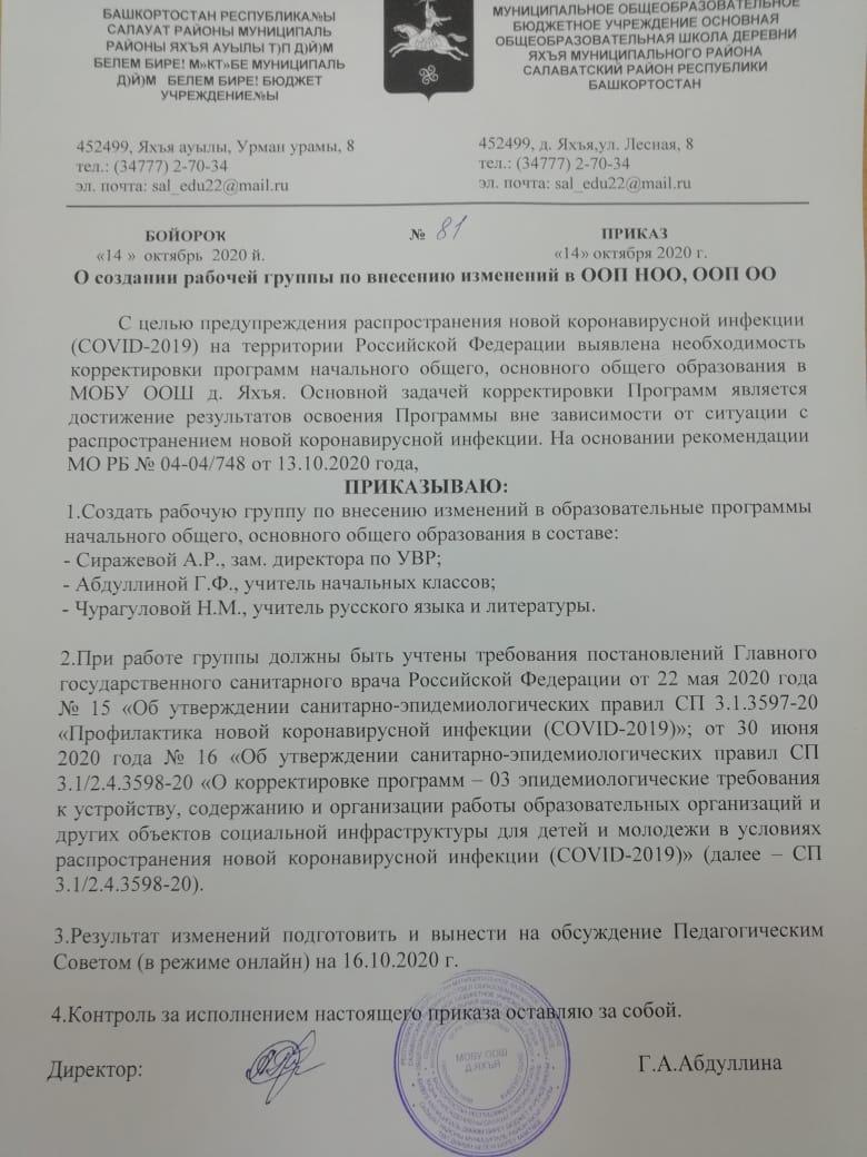 Приказ о создании рабочей группы по внесению изменений в ООП НОО, ООО